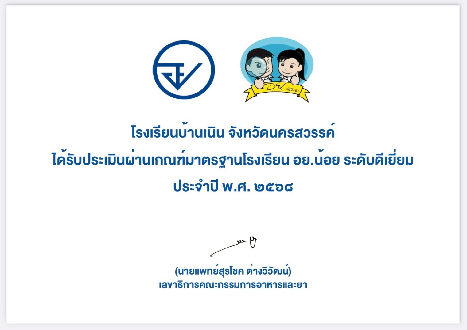 โรงเรียนบ้านเนิน จังหวัดนครสวรรค์ ได้รับการประเมินผ่านเกณฑ์มาตรฐานโรงเรียน อย.น้อย ระดับดีเยี่ยม ประจำปี พ.ศ. 2568 |