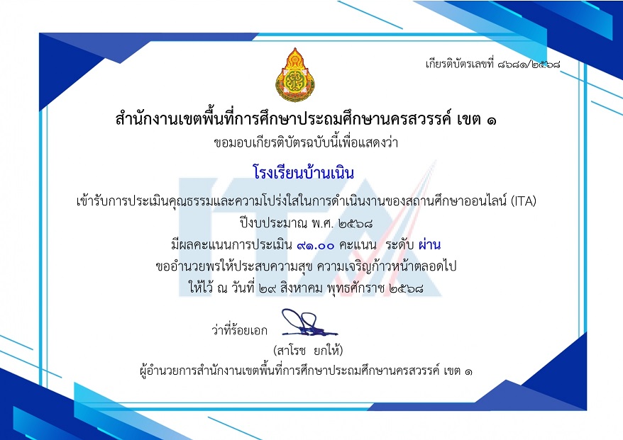 โรงเรียนบ้านเนิน เข้ารับการประเมินคุณธรรมและความโปร่งใสใการดำเนินงานของสถานศึกษาออนไลน์(ITA) ปีงบประมาณ พ.ศ. 2568 มีผลคะแนนการประเมิน 91.00 คะแนน ระดับ ผ่าน |