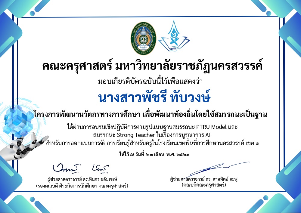 ผ่านการอบรมเชิงปฏิบัติการตามรูปแบบฐานสมรรถนะ PTRU Model และสมรรถนะ Strong Teacher ในเรื่องการบูรณาการ AI |