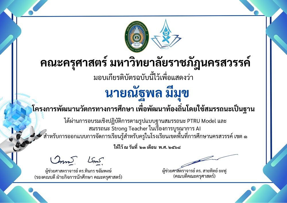 ผ่านการอบรมเชิงปฏิบัติการตามรูปแบบฐานสมรรถนะ PTRU Model และสมรรถนะ Strong Teacher ในเรื่องการบูรณาการ AI |
