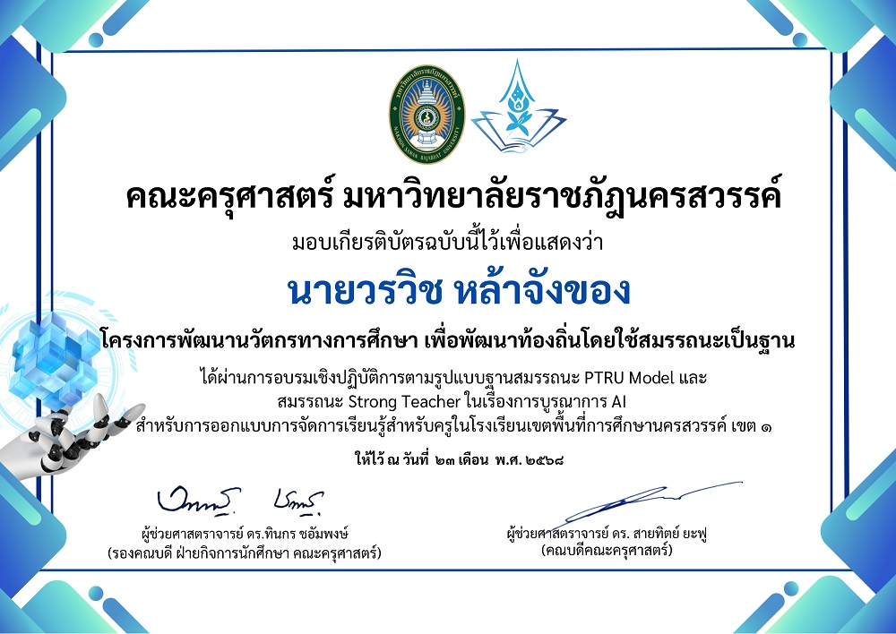 ผ่านการอบรมเชิงปฏิบัติการตามรูปแบบฐานสมรรถนะ PTRU Model และสมรรถนะ Strong Teacher ในเรื่องการบูรณาการ AI |