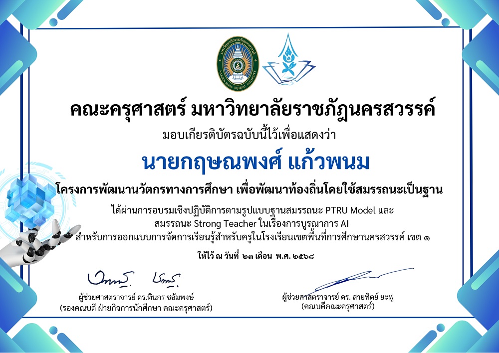 ผ่านการอบรมเชิงปฏิบัติการตามรูปแบบฐานสมรรถนะ PTRU Model และสมรรถนะ Strong Teacher ในเรื่องการบูรณาการ AI |