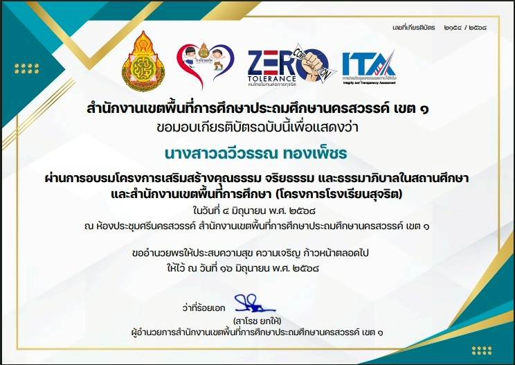 ชื่อผลงาน : การอบรมโครงการส่งเสริมสร้างคุณธรรม จริยธรรม และธรรมาภิบาลในสถานศึกษาและสำนักงานเขตพื้นที่การศึกษา(โครงการโรงเรียนสุจริต)
