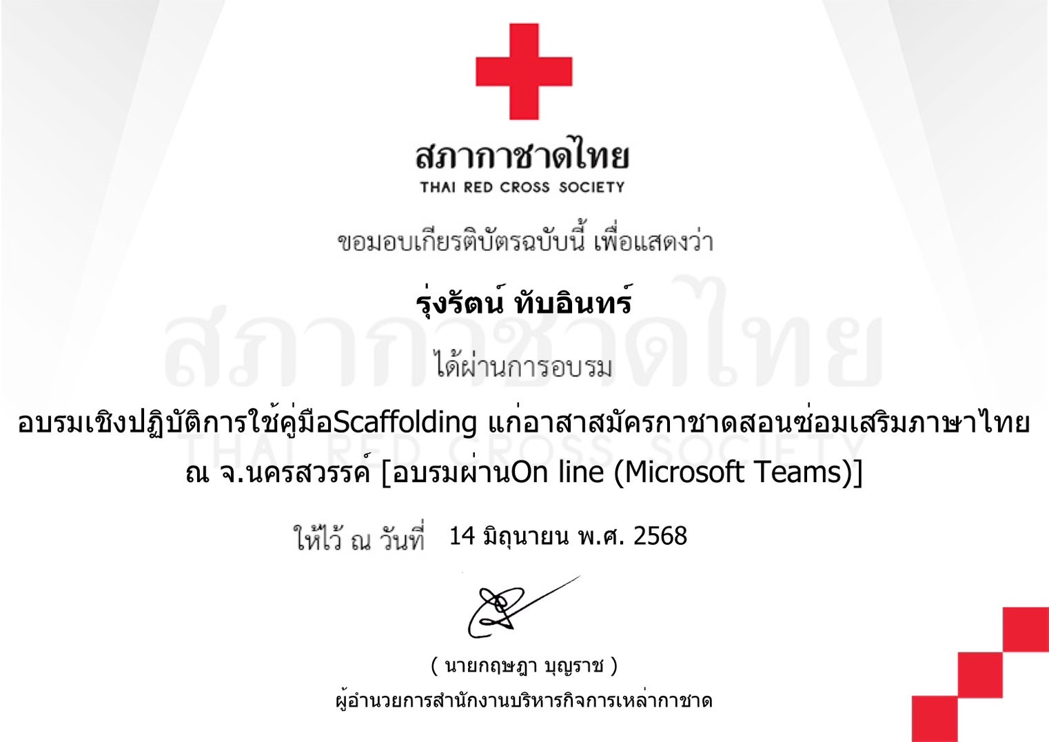 การอบรมเชิงปฏิบัติการใช้คู่มือ Scaffolding แก่อาสาสมัครกาชาดสอนซ่อมเสิรมภาษาไทย ณ จ.นครสวรรค์ (อบรมผ่าน On line (Microsoft Tearms)) |