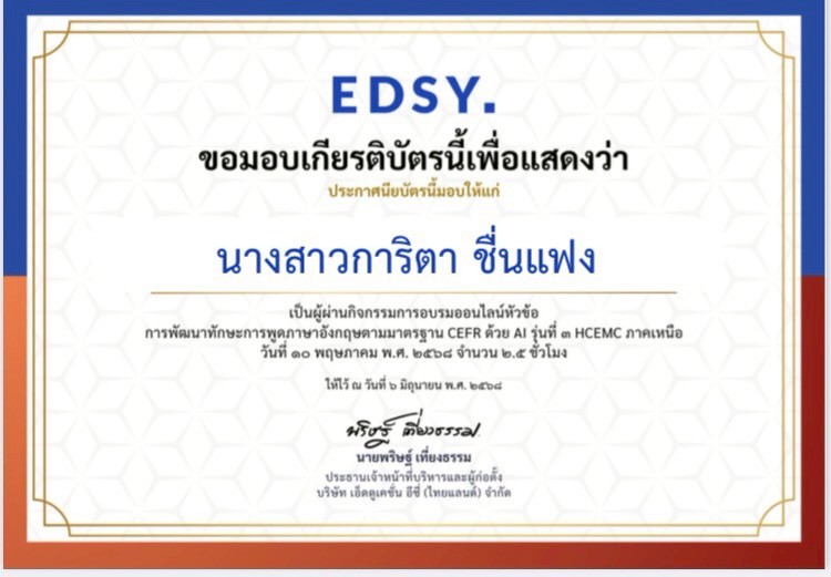 ชื่อผลงาน : กิจกรรมการอบรมออนไลน์หัวข้อการพัฒนาทักษะการพูดภาษาอังกฤษตามมาตรฐาน CEFR ด้วย AI รุ่นที่ 3 HCEMC ภาคเหนือ