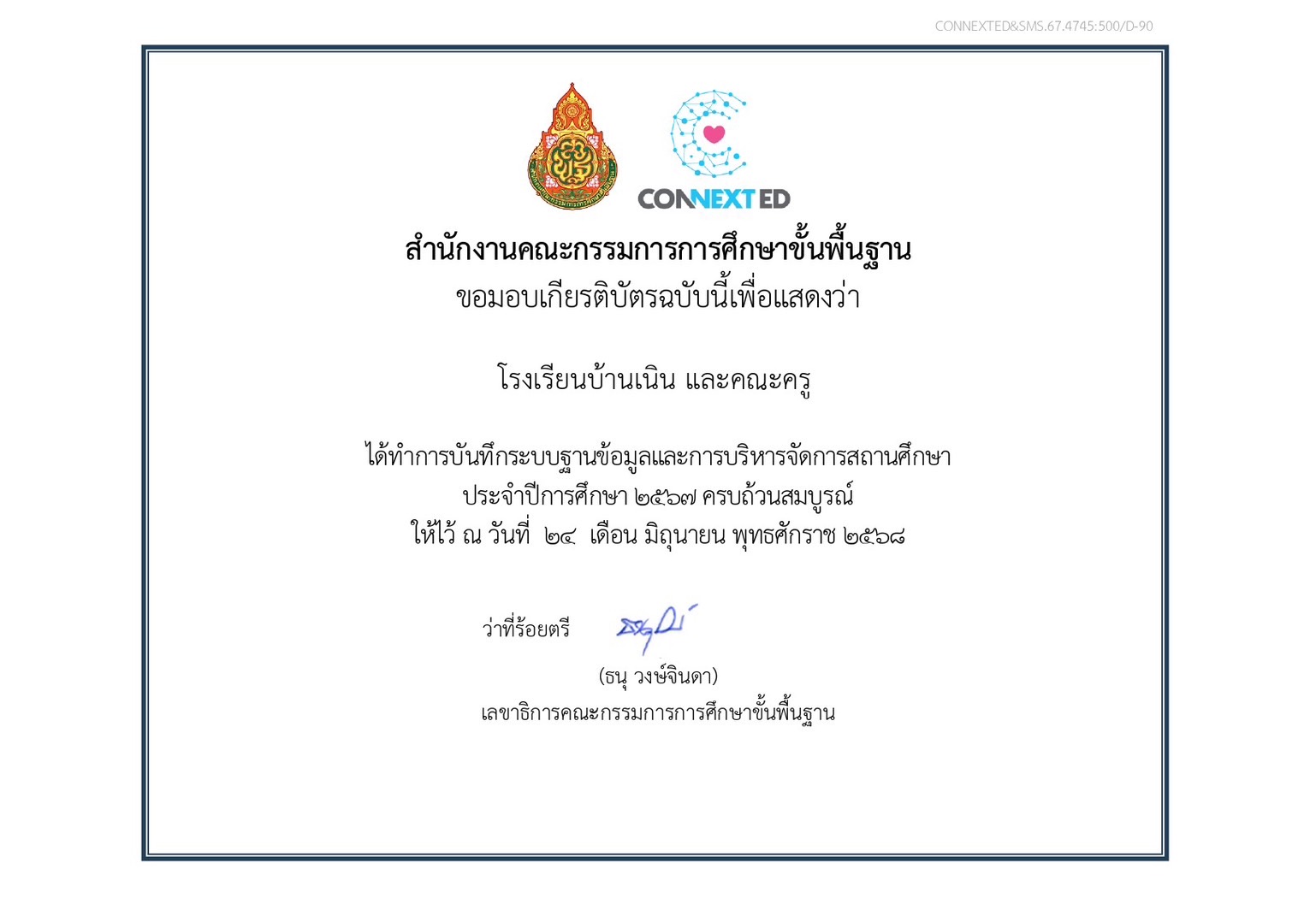 สำนักงานคณะกรรมการการศึกษาขั้นพื้นฐาน มอบเกียรติบัตร เพื่อแสดงว่า โรงเรียนบ้านเนินและคณะครู การบันทึกระบบฐานข้อมูลและการบริหารจัดการสถานศึกษาประจำปีการศึกษา 2567 ครบถ้วนสมบูรณ์ |