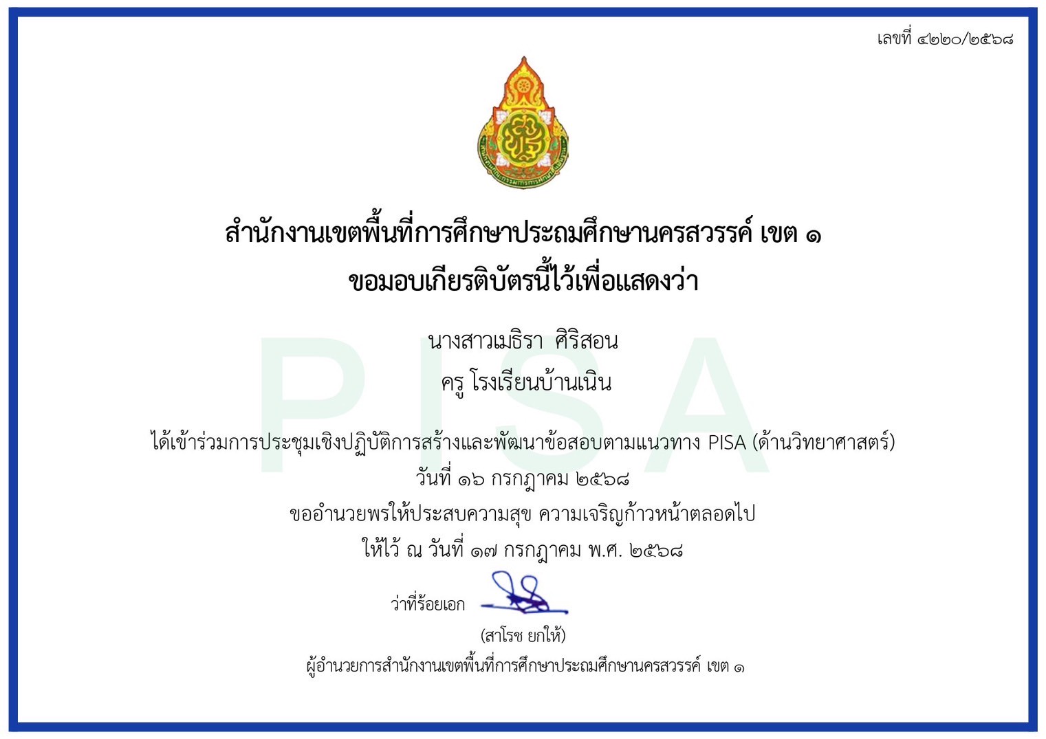 ชื่อผลงาน : เข้าร่วมการประชุมเชิงปฏิบัติการสร้างและพัฒนาข้อสอบตามแนวทาง PISA (ด้านวิทยาศาสตร์)
