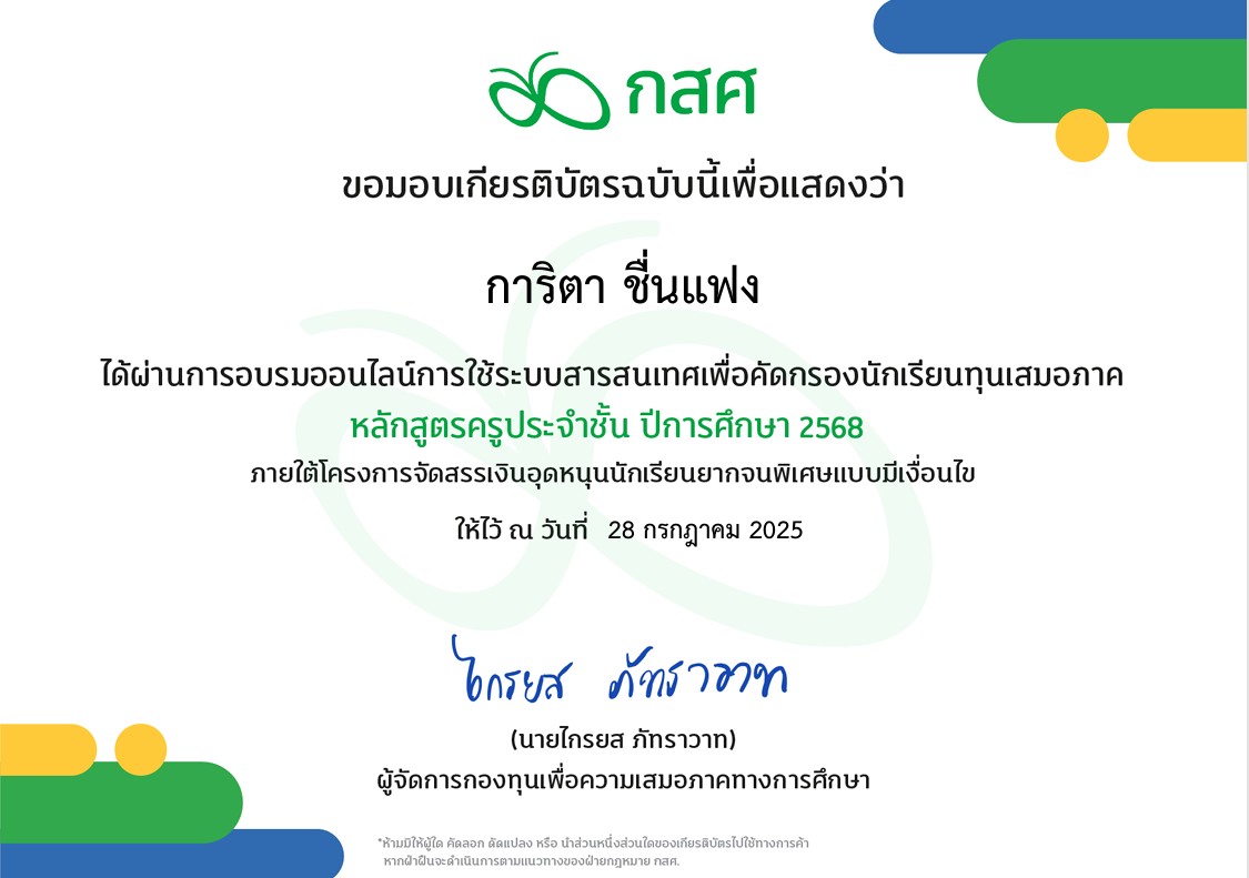 ผ่านการอบรมออนไลน์การใช้งานระบบสารสนเทศ เพื่อคัดกรองนักเรียนทุนเสมอภาค หลักสูตรครูประจำชั้น ปีการศึกษา 2568 ภายใต้โครงการจัดสรรเงินอุดหนุนนักเรียนยากจนพิเศษแบบมีเงื่อนไข |