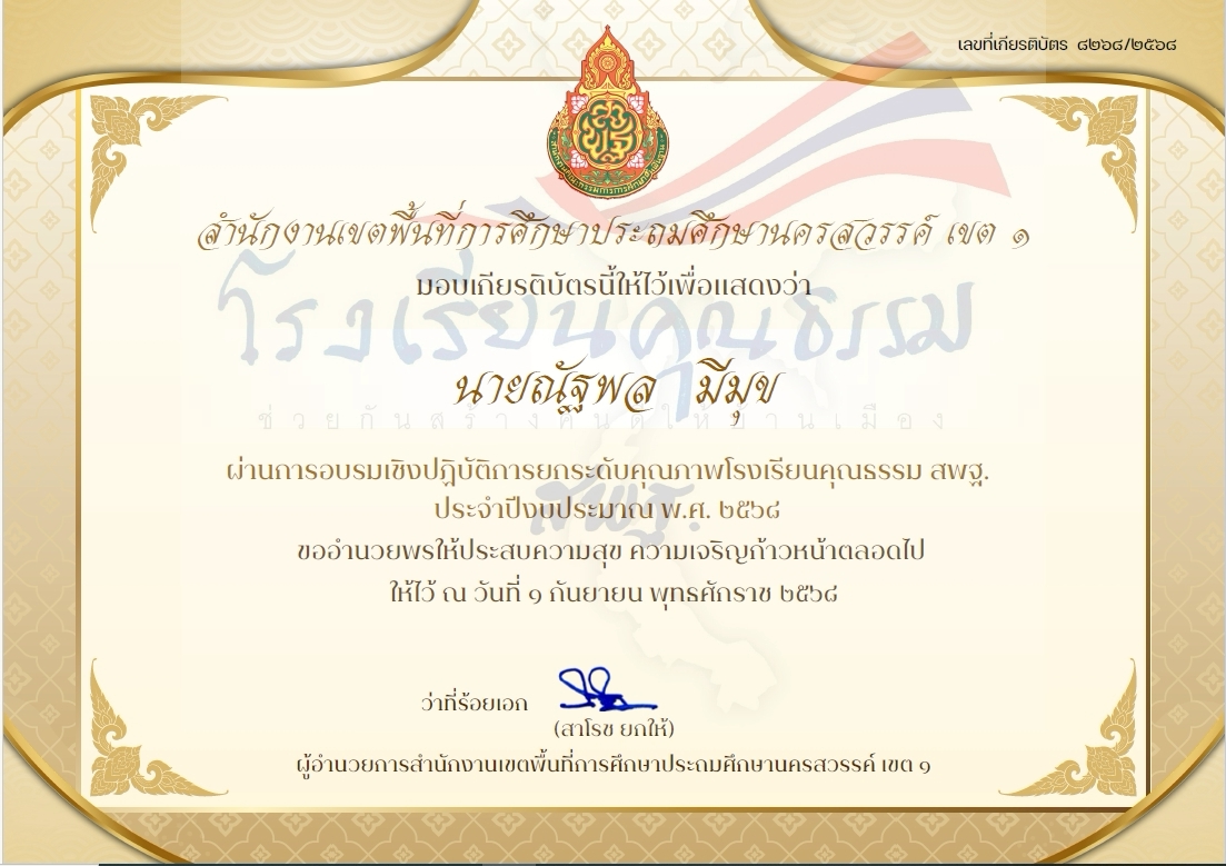 ชื่อผลงาน : ผ่านการอบรมเชิงปฏิบัติการยกระดับคุณภาพโรงเรียนคุณธรรม สพฐ. ประจำปีงบประมาณ 2568
