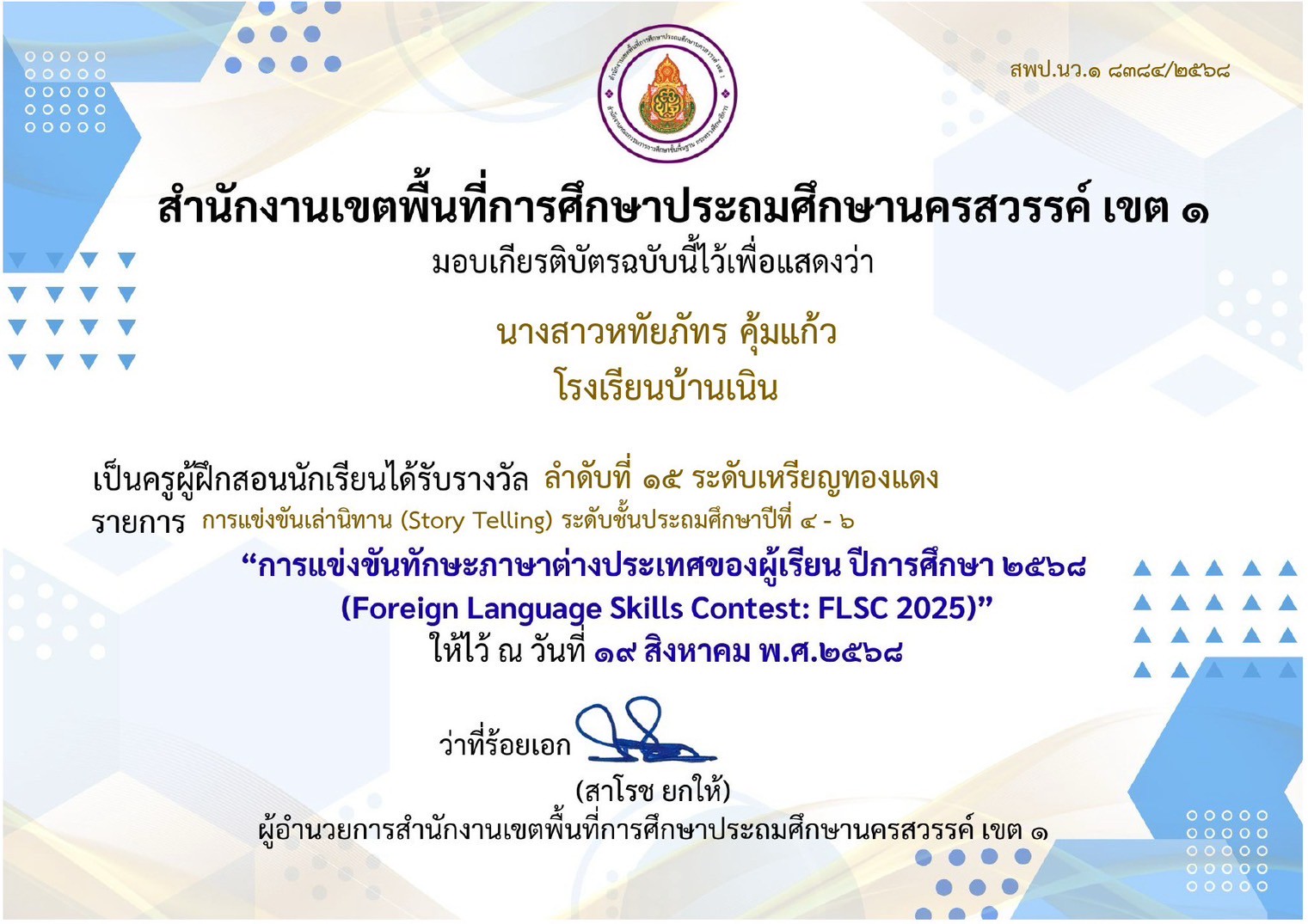 ผู้ฝึกสอนนักเรียนได้รับรางวัล ลำดับที่ 15 ระดับเหรียญทองแดง การแข่งขันเล่านิทาน(Story Telling) ระดับชั้นประถมศึกษาปที่ 4-6 "การแข่งขันทักษะภาษาต่างประเทศของผู้เรียน ปีการศึกษา 2568" (Foreign Language Skills Contest : FLSC 2025) |