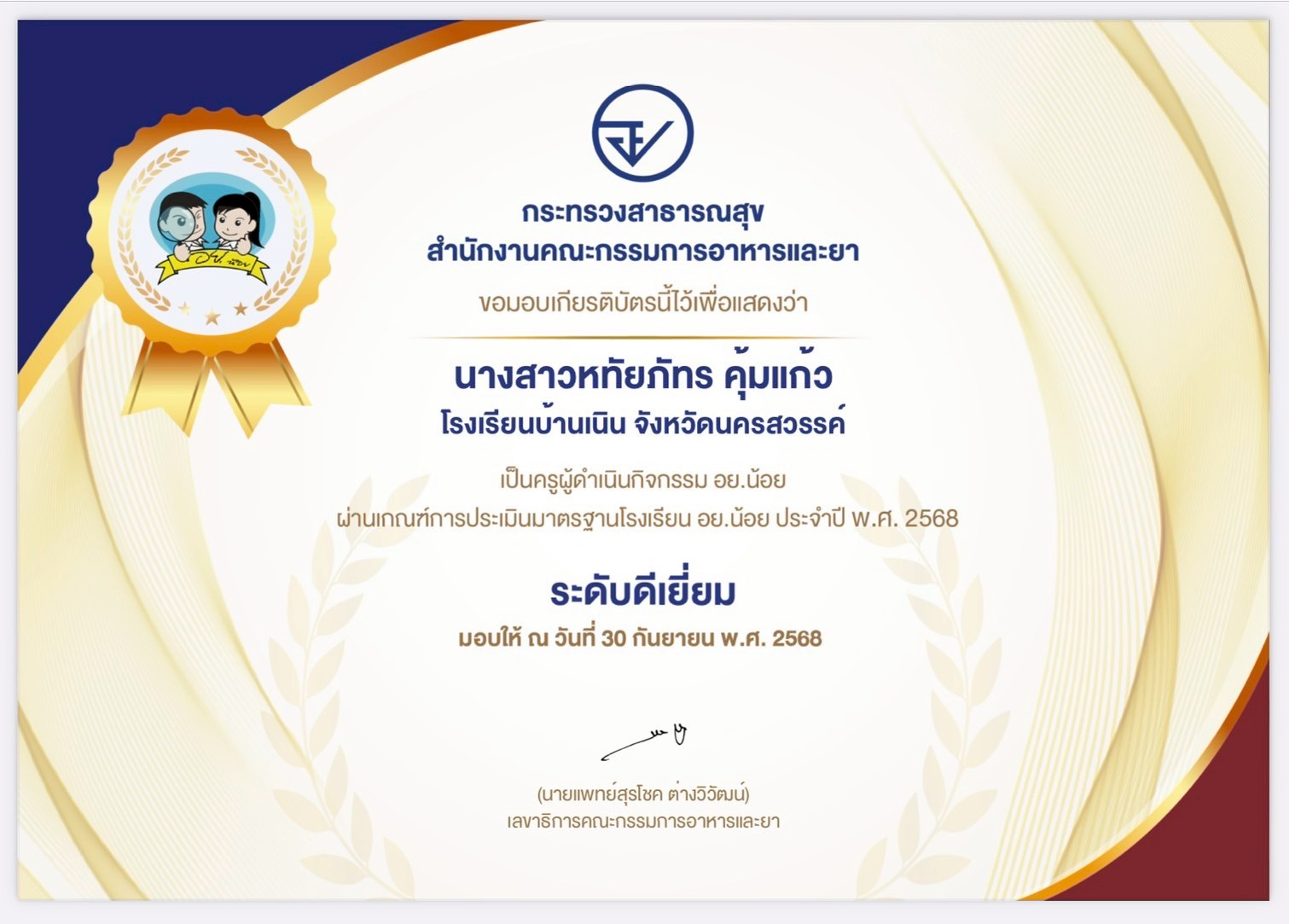 สำนักงานคณะกรรมการอาหารและยากระทรวงสาธารณสุข มอบเกียรติบัตรเพื่อแสดงว่า นางสาวหทัยภัทร คุ้มแก้ว เป็นครูผู้ดำเนินกิจกรรม อย.น้อย ผ่านเกณฑ์การประเมินมาตรฐานโรงเรียน อย.น้อย ประจำปี 2568 ระดับดีเยี่ยม |