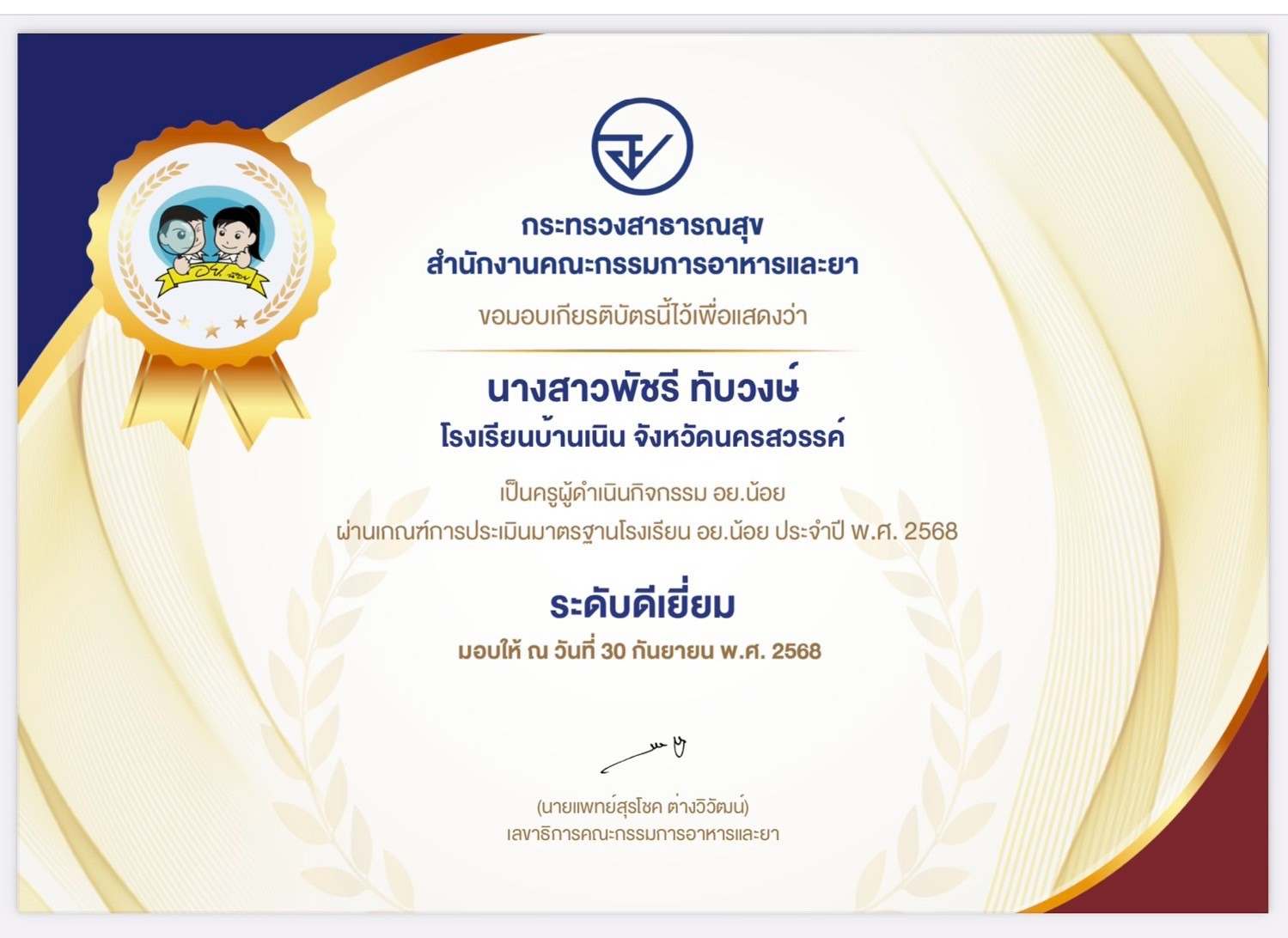 สำนักงานคณะกรรมการอาหารและยากระทรวงสาธารณสุข มอบเกียรติบัตรเพื่อแสดงว่า นางสาวพัชรี ทับวงษ์ เป็นครูผู้ดำเนินกิจกรรม อย.น้อย ผ่านเกณฑ์การประเมินมาตรฐานโรงเรียน อย.น้อย ประจำปี 2568 ระดับดีเยี่ยม |